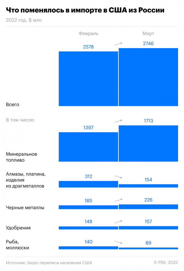 ЕС заморозил почти половину золотовалютных резервов ЦБ, а также запретил импорт угля из России. США запретили импорт российских энергоносителей, в том числе сырую нефть.