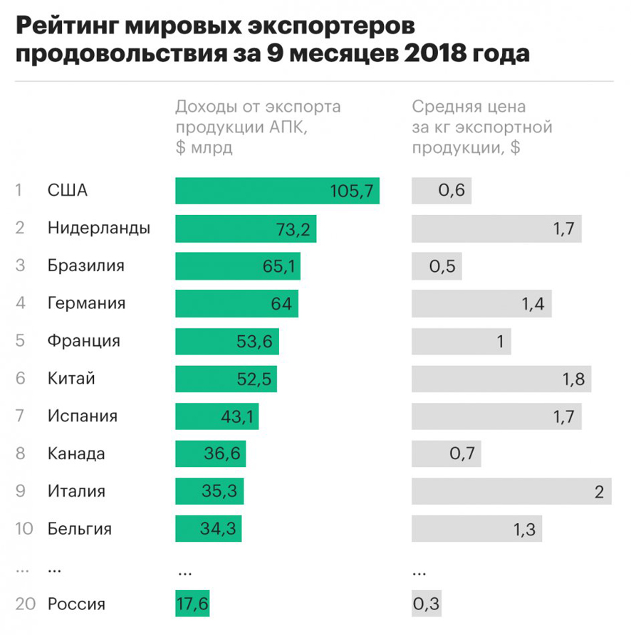 В рейтинге мировых экспортеров продукции агропромышленного комплекса (АПК) Россия занимает 20-е место, подсчитала консалтинговая группа «НЭО Центр» по итогам девяти месяцев 2018 года. За этот период на экспорт из России было отправлено 56,9 млн т продовольствия стоимостью $17,6 млрд. Средняя цена 1 кг сельхозпродукции составила, таким образом, $0,31, что на 10% меньше, чем за аналогичный период предыдущего года. Для сравнения: у США, мирового лидера по экспорту сельхозпродукции, отгрузившего за границу 169,2 млн т, доходы от таких поставок оцениваются в $105,7 млрд, а средняя цена 1 кг в два раза выше — $0,6.