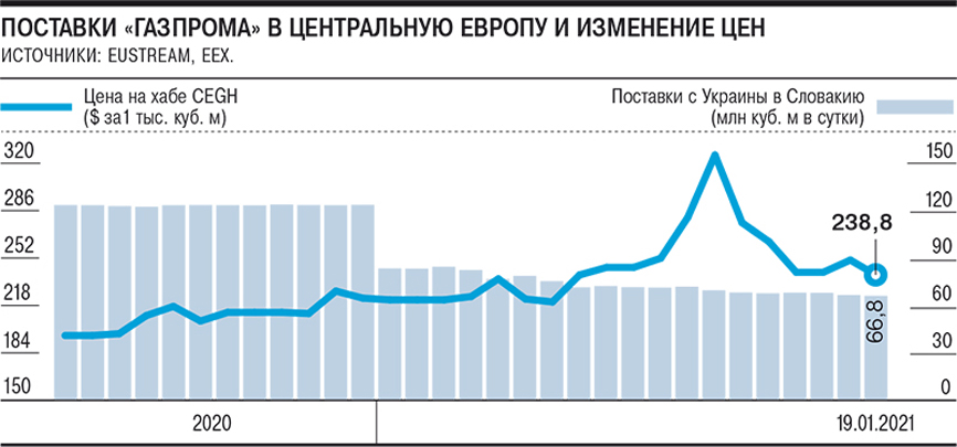 Более того, «Газпром» стремится поддерживать высокие цены на европейском спотовом рынке, полностью прекратив продажи газа со своей электронной торговой площадки для поставки в ближайшие месяцы. Если в середине прошлого года компания порой продавала через ЭТП дополнительно до 1 млрд кубометров в месяц, в основном с поставкой в следующие сутки или следующий месяц, то с середины декабря «Газпром» продает там газ с поставкой не раньше лета или третьего квартала 2021 года. В результате покупатели вынуждены приобретать дополнительные объемы на хабах, что способствует поддержанию там высоких цен и стимулирует трейдеров поднимать газ из ПХГ. Так, на хабе CEGH в австрийском Баумгартене цены за месяц взлетели на 31%, до $258 за 1 тыс. кубометров, а на прошлой неделе превышали $330 за 1 тыс. кубометров.