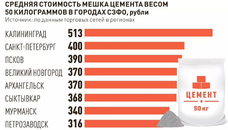 Доставку цемента, стекловаты, металлопроката и дерева к концу года пришлось полностью переключить на море, что привело к дополнительным расходам на логистику и зеркальному росту цен. Сегодня 50-килограммовый мешок цемента в Калининградской области в среднем обходится в 513 рублей - это самый высокий показатель среди всех регионов Северо-Запада.