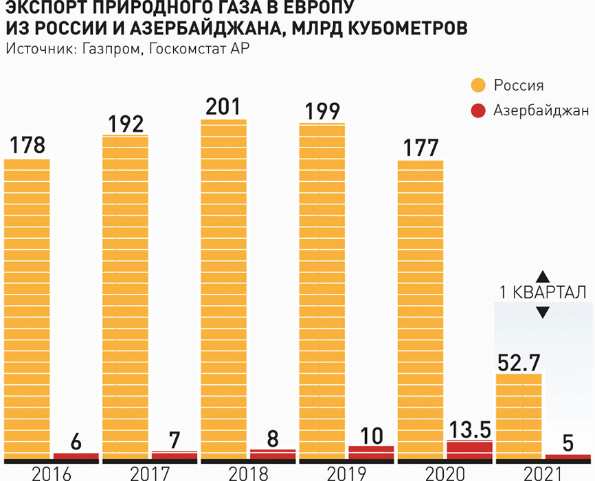 За пять лет экспорт газа из Азербайджана в Европу вырос в три раза, преодолел границы Турции и теперь доходит до Греции и Италии. На фоне российских поставок, покрывающих 32,2% потребностей европейского рынка (по данным 2020 года), экспорт азербайджанского газа продолжает казаться незначительным. Но если в 2016 году он составлял всего 3% от российского, то в I квартале 2021 года - почти 10%.