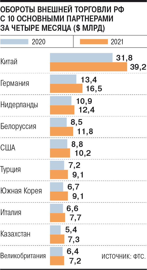 Также росту товарооборота в денежном выражении способствуют и инфляционные процессы, поскольку серьезно подорожала вся продукция, в частности металлы, сырье, химикаты, дополняет член совета директоров международной аудиторско-консалтинговой сети FinExpertiza Агван Микаелян. Но это играет России на руку, отмечает эксперт. В ЕФСР ожидают при этом, что стоимостные объемы экспорта в ЕС вернутся на докризисный уровень в конце 2021 — начале 2022 года.