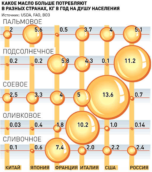 Структура потребления растительных масел в России не будет сильно меняться в ближайшие несколько лет, делают вывод в Центре агроаналитики. Если во всем мире пальма первенства давно остается за "пальмой", в России оно занимает второе место с большим отрывом от традиционного подсолнечного, и в обозримой перспективе это так и останется.