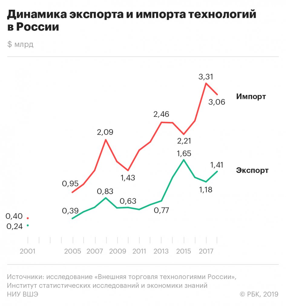 В 2018 году объем экспорта технологий составил $1,4 млрд. Покупать технологии России при этом приходится на вдвое большую сумму