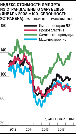 Банк России и независимые эксперты зафиксировали увеличение стоимости импорта с учетом сезонности, притом что вплоть до июня 2019 года аналитики, напротив, говорили об его снижении (см. “Ъ” от 11 сентября). По оценкам Центра развития (ЦР) ВШЭ, стоимость ввозимых из дальнего зарубежья товаров увеличивалась все лето: на 0,6% (месяц к месяцу) в июне, на 2,5% в июле и на 0,6% — в августе. В июне и июле этому способствовало укрепление рубля (на 0,3% и 1,5% за месяц в реальном выражении), но и в августе, несмотря на значительное ослабление рубля (на 2,8%), импорт не снизился, как это было год назад, отмечается в опубликованном вчера выпуске «Комментариев о государстве и бизнесе». По оценкам же аналитиков департамента исследований и прогнозирования ЦБ (ДИП), импорт после очистки от сезонности в июле—августе превысил средний уровень второго полугодия 2018-го — первого полугодия 2019 года, но оставался ниже локальных пиков второго полугодия 2017-го — первого полугодия 2018 года.