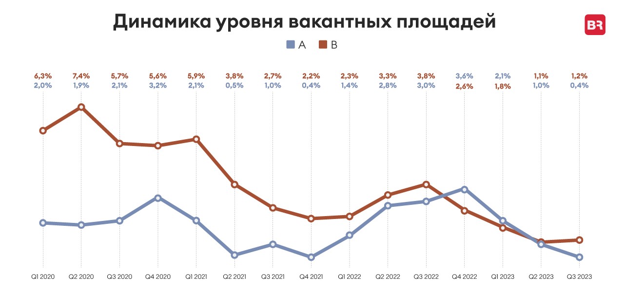 К концу сентября 2023 года вакантность составила 5,2% от общего объема предложения Узбекистана, которое приходится на незанятые спекулятивные площади. Свободных площадей класса А на рынке практически не осталось – их доля не превышает 1% от общего предложения.