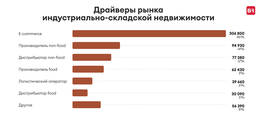 Среди драйверов спроса необходимо отметить также производителей и дистрибьюторов non-food, их доля в структуре поглощения составила 26%. Суммарно компании этих сегментов бизнеса заняли 172 310 кв. м.