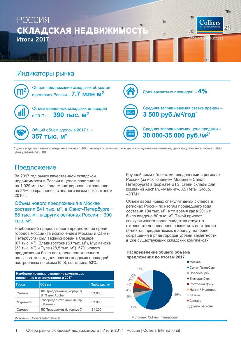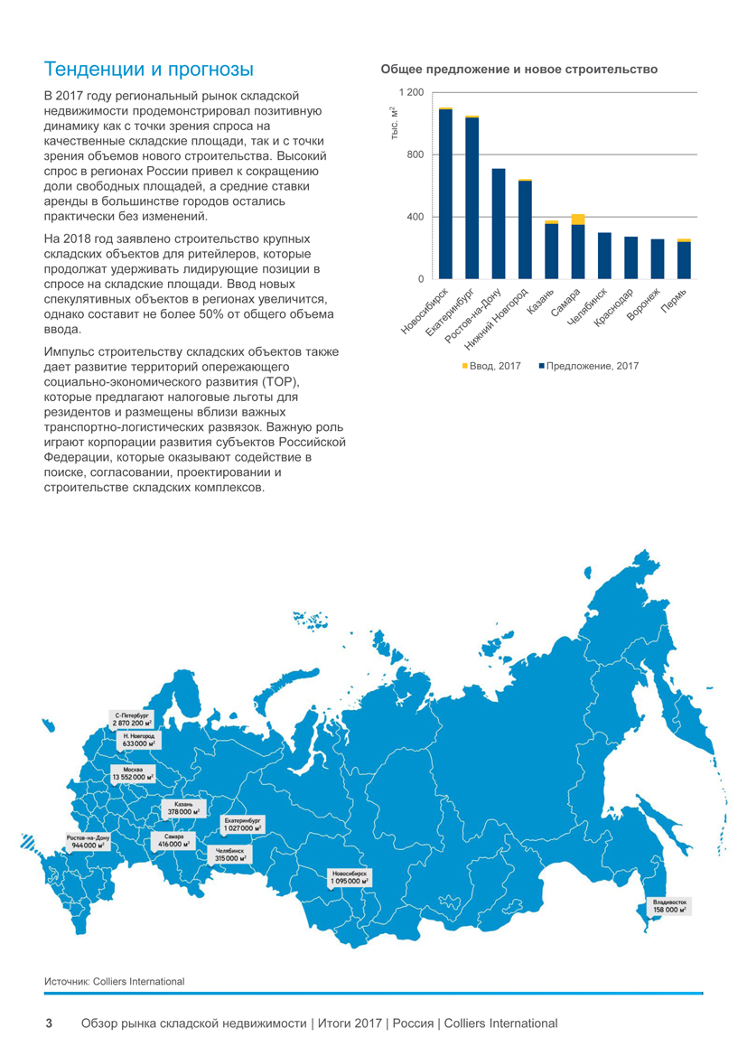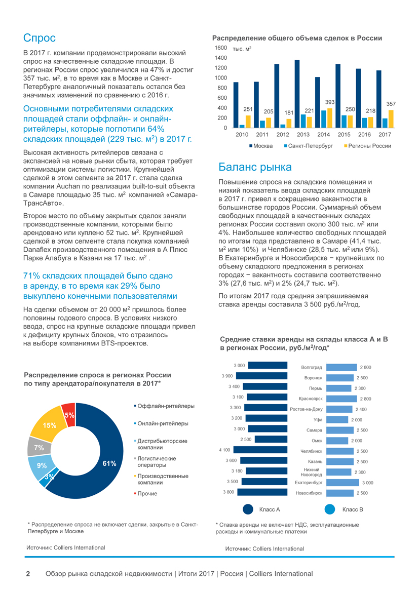 За 2017 год рынок качественной складской недвижимости в России в целом пополнился на 1,029 млн кв. м, продемонстрировав сокращение на 25% по сравнению с аналогичными показателем 2016 г. В 2017 г. компании продемонстрировали высокий спрос на качественные складские площади. В регионах России спрос увеличился на 47% и достиг 357 тыс. кв. м, в то время как в Москве и Санкт-Петербурге аналогичный показатель остался без значимых изменений по сравнению с 2016 г. Повышение спроса на складские помещения и низкий показатель ввода складских площадей в 2017 г. привел к сокращению вакантности в большинстве городов России. Суммарный объем свободных площадей в качественных складах регионах России составил около 300 тыс. кв. м или 4%.