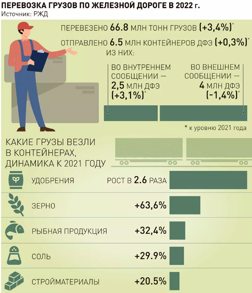 В феврале грузоперевозки во внутрироссийском сообщении на 2,8% выше показателя февраля прошлого года, в том числе: строительные грузы (+32%); удобрения (+10,7%); железная руда (+5,4%).