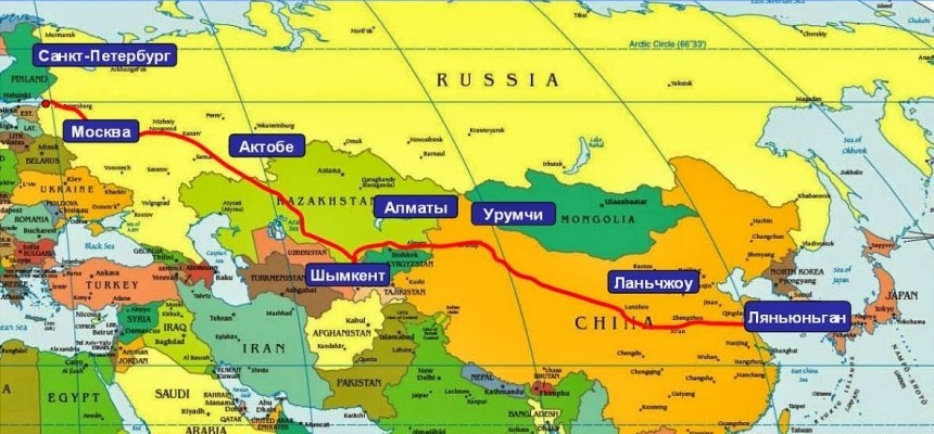 Казахстан: Жайсан – Актобе – Кызылорда – Шимкент – Тараз – Алматы – Коргас – граница с Китайской Народной Республикой.