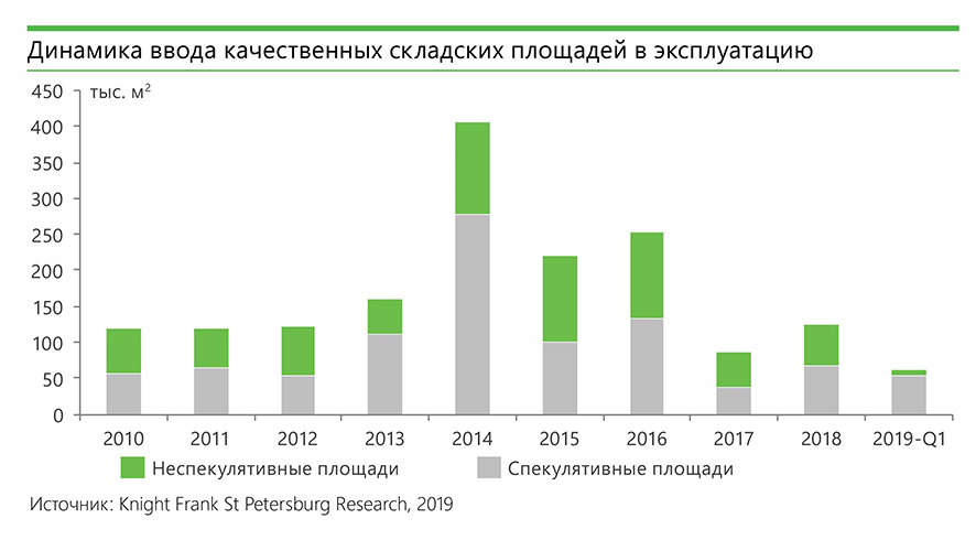 По итогам I квартала 2019 г. на рынке качественной складской недвижимости было введено в эксплуатацию 6 объектов суммарной площадью 63 тыс. кв. м.
