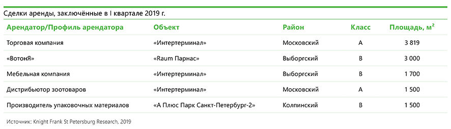 Тенденция к увеличению спекулятивного ввода в I квартале 2019 г. продолжилась: 85% новых площадей было предназначено для рынка аренды. Единственным объектом, построенным для собственных нужд, стал склад компании «Нэнси» площадью 3,4 тыс. кв. м на территории «Мебельного технопарка». Объем сделок аренды со складами класса А и B по итогам I квартала 2019 г. превзошел показатель I квартала 2018 г. в 2,7 раз и составил около 49 тыс. кв. м. Илья Князев, руководитель отдела складской и индустриальной недвижимости Knight Frank St Petersburg, отмечает, что в I квартале 2019 г. арендаторы из сегмента розничной торговли сохранили за собой лидирующую позицию в сделках аренды — объем занятых ими площадей составил около 34 тыс. кв. м.