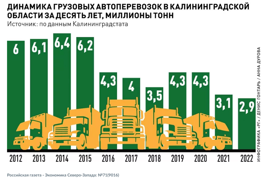"По итогам работы 2022 года в Калининград по суше фактически перевезен 1 млн тонн грузов и еще 25 тыс. тонн вывезено на территории России. При этом квота ЕС на ввоз составляла более 3 млн тонн и 50 тыс. тонн на вывоз. Мы квоту не выбрали на 66%, соответственно, мы сами себя загоняем в угол. Квоты - среднее арифметическое объемов провозимых железной дорогой грузов за последние три года. На текущий год Литва уже снизила объем квот на 7%, а в 2024 году положение может усугубиться еще больше", - заявил Кукушкина.