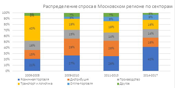 В материалах добавляется, что операторы сектора e-commerce сектора в объеме складского рынка России в настоящее время занимают не более 4% (1 млн кв.м), однако сегмент продолжает активно расти на фоне общей стагнации сферы розничной торговли. Темпы роста онлайн-розницы составляют порядка 25-30% в год.