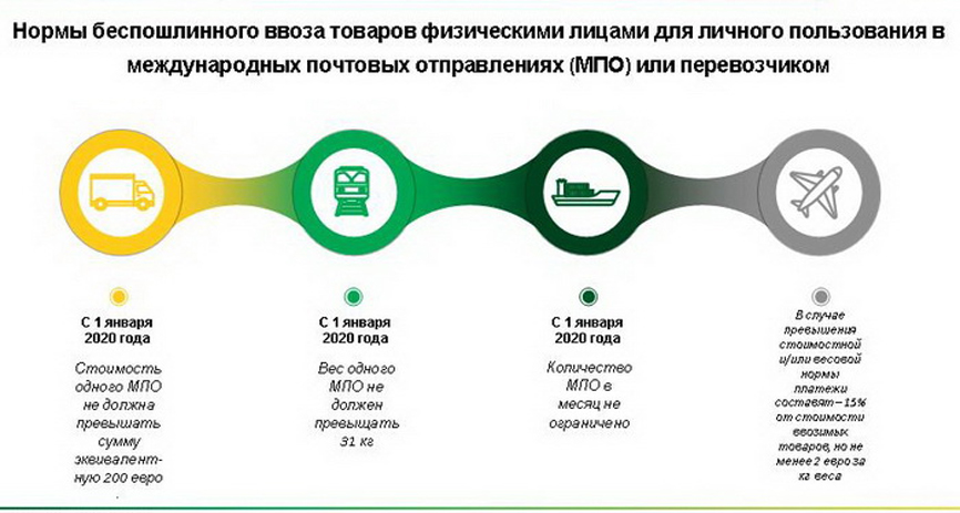 С первого января 2020 года действуют нормы беспошлинного ввоза товаров для личного пользования: стоимость содержимого одного МПО не должна превышать сумму, эквивалентную 200 евро. При этом вес посылки не должен превышать 31 кг. Количество МПО в месяц не ограничено. В случае превышения стоимостной и/или весовой нормы, необходимо будет заплатить таможенные платежи в размере 15% от стоимости ввозимых товаров, но не менее 2 евро за килограмм веса в части превышения.