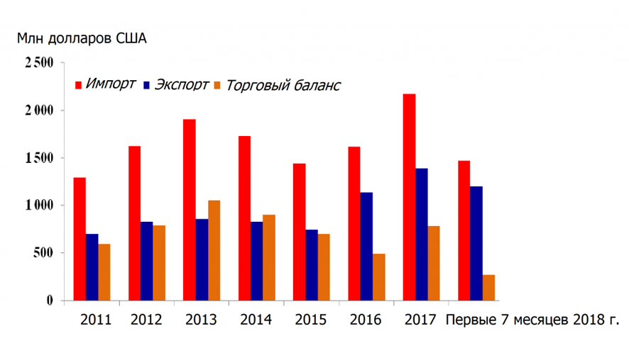 В январе-ноябре 2018 года товарооборот государств ЕАЭС с Кубой увеличился на 6,8% до 377,1 млн долл. Экспорт стран ЕАЭС на Кубу составил 349,6 млн долл., а импорт – 27,5 млн долл. Основным фактором увеличения экспорта было наращивание вывоза на Кубу минеральных продуктов (на 24%), а также машин, оборудования и транспортных средств (на 5,4%).