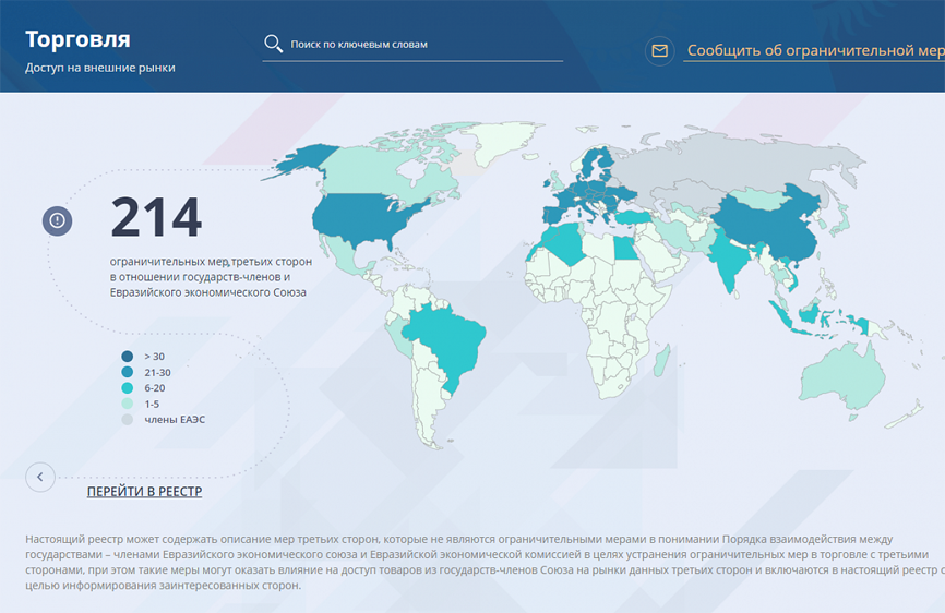 Блоком по торговле Евразийской экономической комиссии запущен информационный портал, на котором размещен Реестр ограничительных мер третьих сторон в отношении стран ЕАЭС и Союза в целом. Информацию можно найти по ссылке https://trade.eaeunion.org/. Реестр представлен в виде интерактивного ресурса, на котором участник внешнеэкономической деятельности может найти полезные сведения, а также сообщить о проблемах с доступом на внешние рынки, заполнив соответствующую форму на сайте.