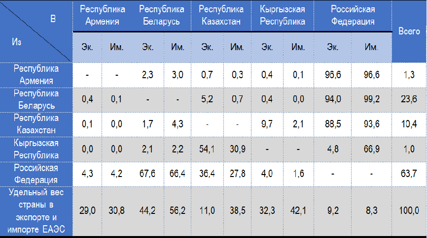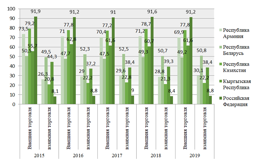 В разрезе экспортно-импортных операций можно отметить значительную долю экспорта в страны ЕАЭС в Республике Беларусь (44,2%). В остальных странах доля такого экспорта не превышает 33%. По импорту можно отметить значительную долю также в Беларуси (56,2% совокупного экспорт страны). По остальным странам показатель можно отметить тоже достаточно существенным (в Армении – 30,8%, в Казахстане – 38,5%, в Кыргызстане – 42,1%). В Российской Федерации показатель очень низкий – 8,3% от совокупного импорта страны. Такие показатели по экспортно-импортным операциям (кроме Беларуси) нельзя назвать преобладающими над внешней торговлей с третьими странами.