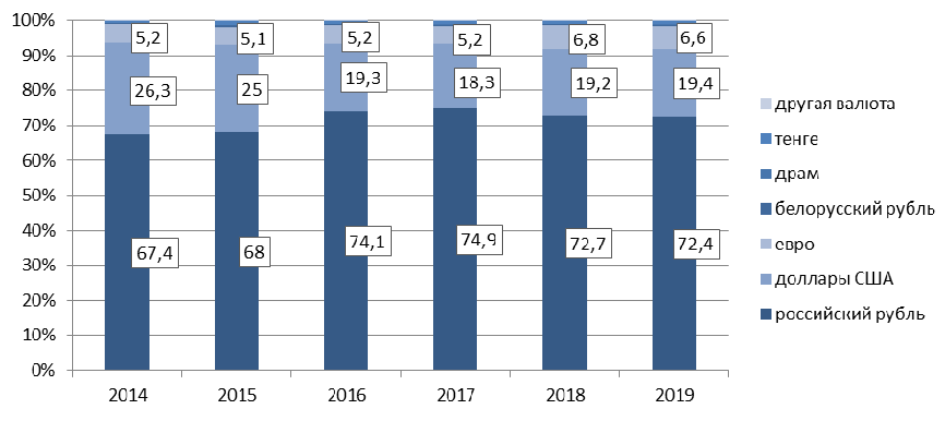 На рис. 2 приведены обобщенные данный о валютной структуре платежей между государствами ЕАЭС.