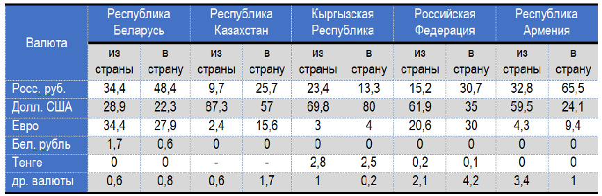 Можно сделать вывод о том, что в расчетах внутри сообщества выступает преимущественно российский рубль (валюта одной из стран-участниц ЕАЭС), а в расчетах с третьими странами в некоторых странах преимущество уже у доллара США. С учетом высокой доли доллара США в расчетах с третьими странами целесообразно минимизировать долю расчета в резервной валюте (долларах США) внутри сообщества за счет наращивания долей расчетов в национальных валютах либо использования единой единицы расчетов.