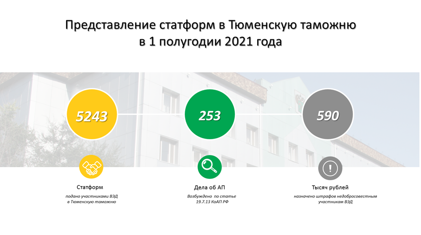 «Тюменская таможня на постоянной основе проводит работу по борьбе с нарушением порядка представления статформ учета перемещения товаров. За первое полугодие 2021 года в таможню представлено более 5000 статистических форм учета перемещения товаров. По фактам непредставления или подачи статформ с нарушениями возбуждено 253 дела об административном правонарушении, недобросовестным участникам взаимной торговли Тюменской и Курганской областей, Ханты-Мансийского и Ямало-Ненецкого автономных округов назначены наказания в виде штрафов на общую сумму 590 тысяч рублей» - поделилась начальник отдела таможенной статистики Тюменской таможни Евгения Губанова.